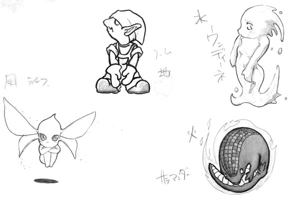 四精霊達(ボツ)。ディオラムスのゲーム中で移動する際、後ろのほうで追っかけるようにつくオプションとして出す予定でした。攻撃の際、キャラクターが攻撃した後、彼らが追加攻撃したりとか・・・。
